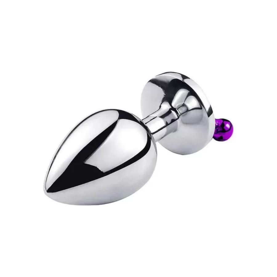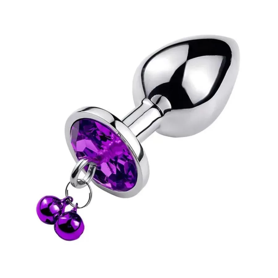 💎 Tapón anal de acero con joya púrpura y 🔔 campana, talla M (8,2 cm x 3,3 cm). Seguro, elegante y fetichista. Envío 📦 discreto a todo el Perú.